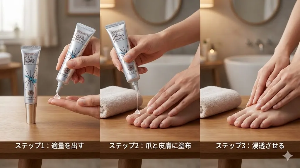 注意: お風呂に入れない日は、洗面器にお湯を張り、5分ほど足浴をしてから塗りましょう。乾燥したカチカチの爪に塗っても、表面で乾くだけで中に入っていきません。