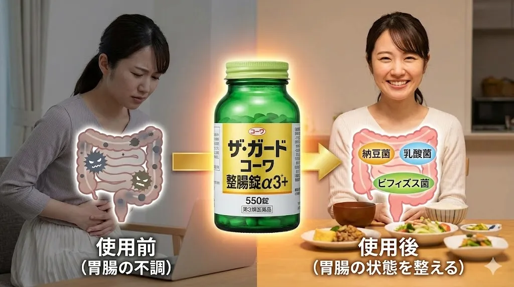 便秘とお腹のハリ、そして胃もたれ。「ザ・ガードコーワ整腸錠α3+」は、それらの不快な症状をまとめてケアしてくれる非常に頼もしい存在です。